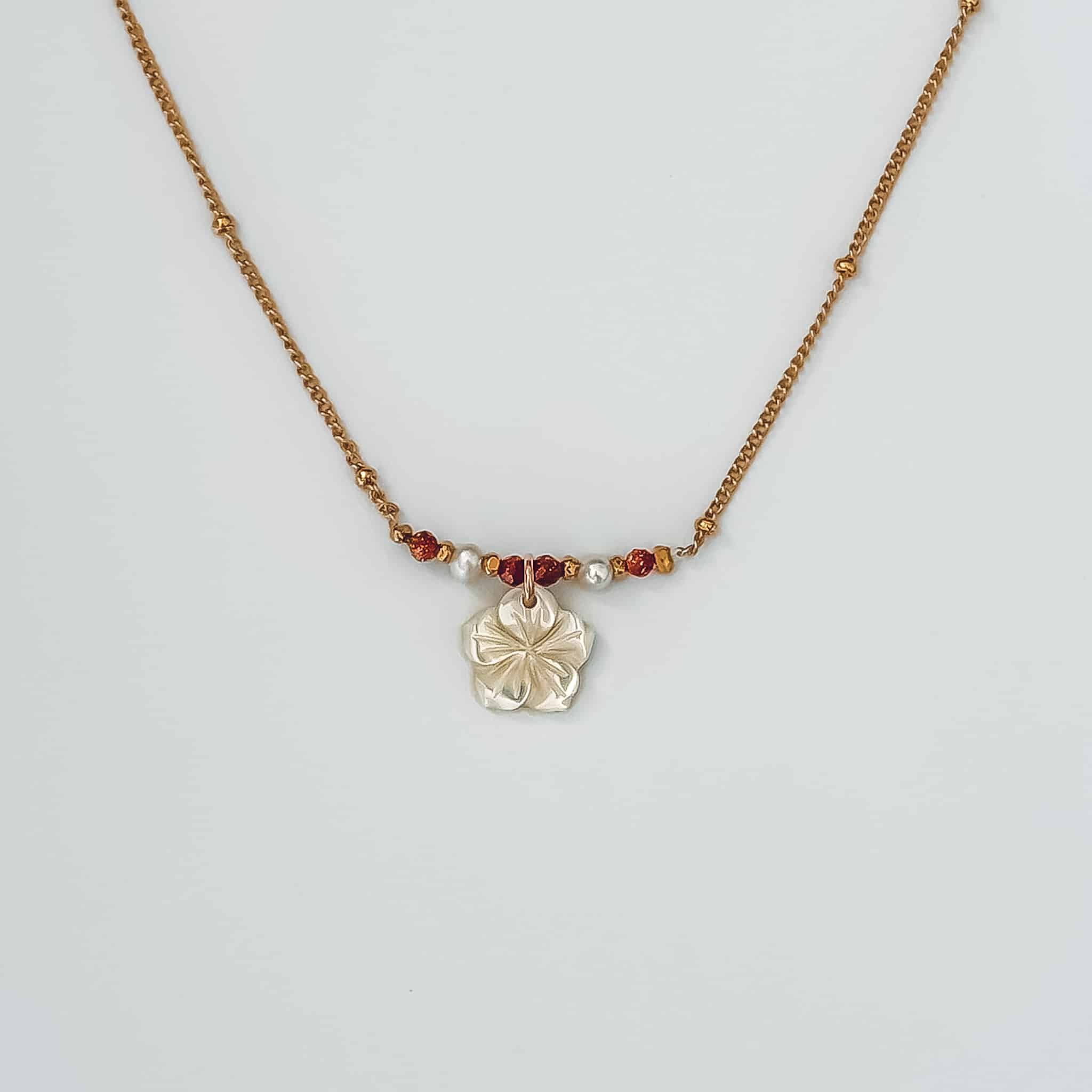 Le ras de cou Hibiscus associe une fleur en nacre délicatement sculptée, des perles naturelles et des pierres du soleil lumineuses pour un bijou solaire inspiré des fleurs tropicales Paiement sécurisé — CB & PayPal3x sans frais — Avec AlmaLivraison offerte dès 50€— Réunion & MétropoleGarantie 2 ans — Bijoux réparablesRetours sous 30 jours — Satisfait ou remboursé