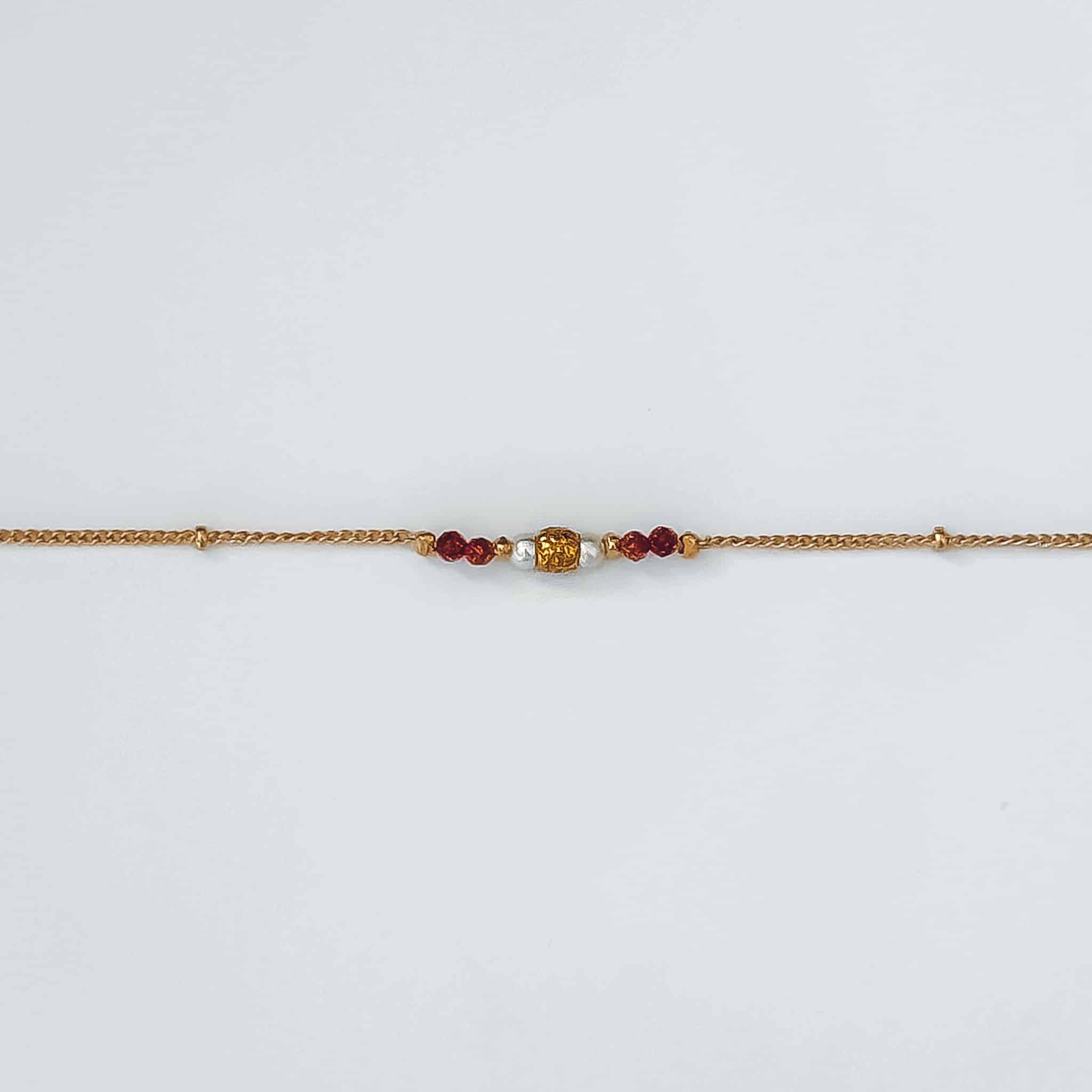 Le bracelet Ocre associe une chaîne perlée délicate, des pierres de soleil lumineuses et une perle centrale texturée pour un bijou solaire inspiré des couleurs chaudes de la terre et du soleil. Paiement sécurisé — CB & PayPal3x sans frais — Avec AlmaLivraison offerte dès 50€— Réunion & MétropoleGarantie 2 ans — Bijoux réparablesRetours sous 30 jours — Satisfait ou remboursé